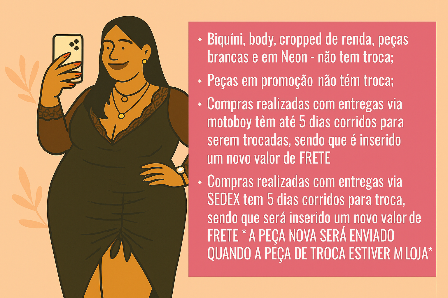 • Compras com entrega via motoboy têm até 5 dias corridos para troca, com cobrança de novo valor de frete;